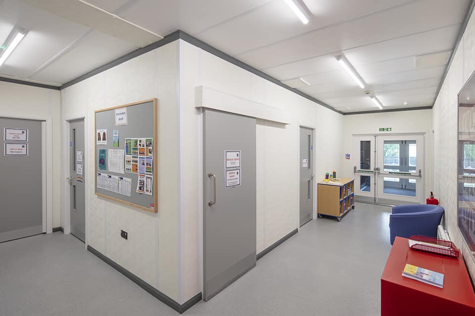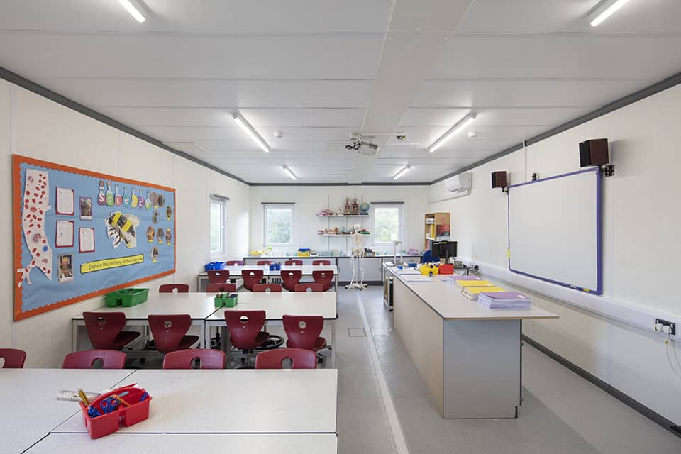 Facilities included: art classroom, science classroom, service connections, electrics and data points for teaching walls, corrugated steel staircase, pupil and staff toilets, disabled toilets, staff offices, staff room, plant room, cleaners’ closet, and forced ventilation for doublewidth classroom spaces.
