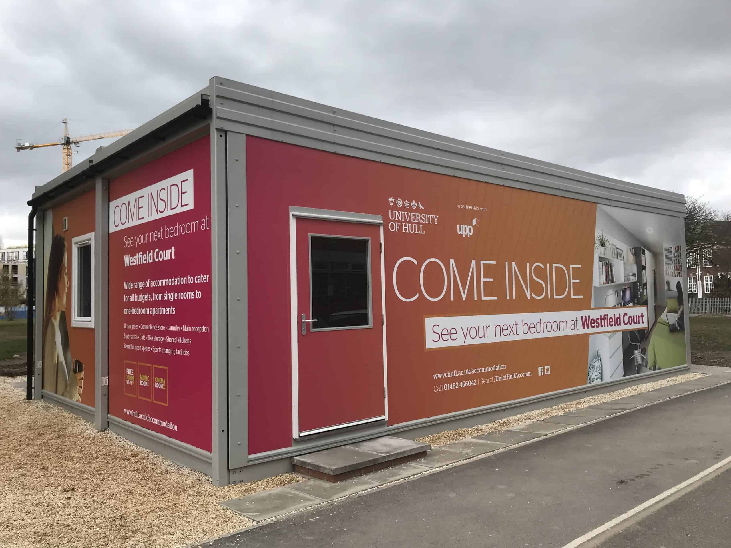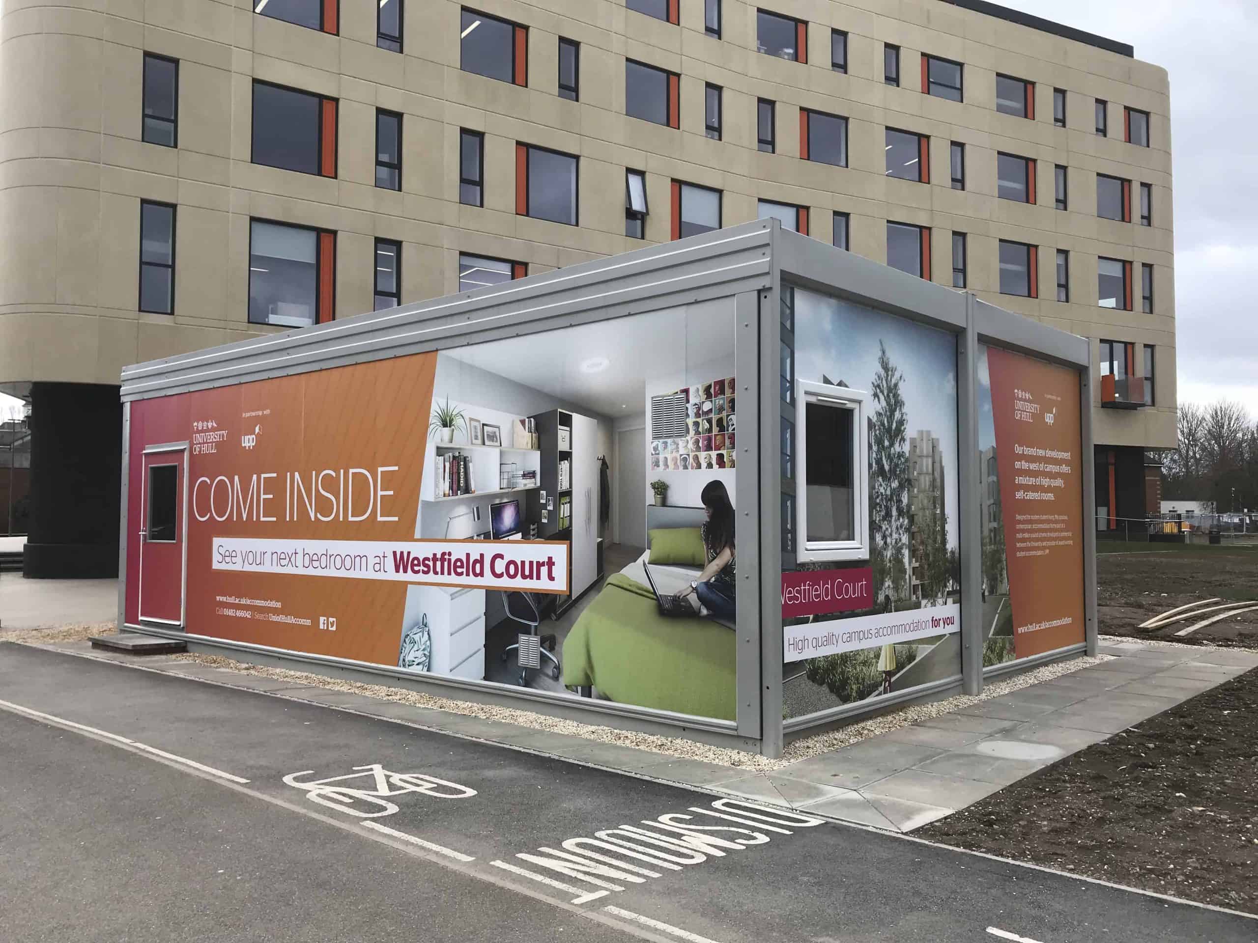 Our creative and innovative use of space allowed for an inspiring sales environment to ensure the team could encourage sign-ups, boosting investment and securing ROI.Sleek and contemporary, the sales suite incorporated a bespoke exterior to encourage visitors to ‘come inside’ with inspirational lifestyle images to help it stand out on a busy campus.Installing the module on a bustling university campus, disruption was kept to a minimum and our years of experience allowed for a quick and speedy install.