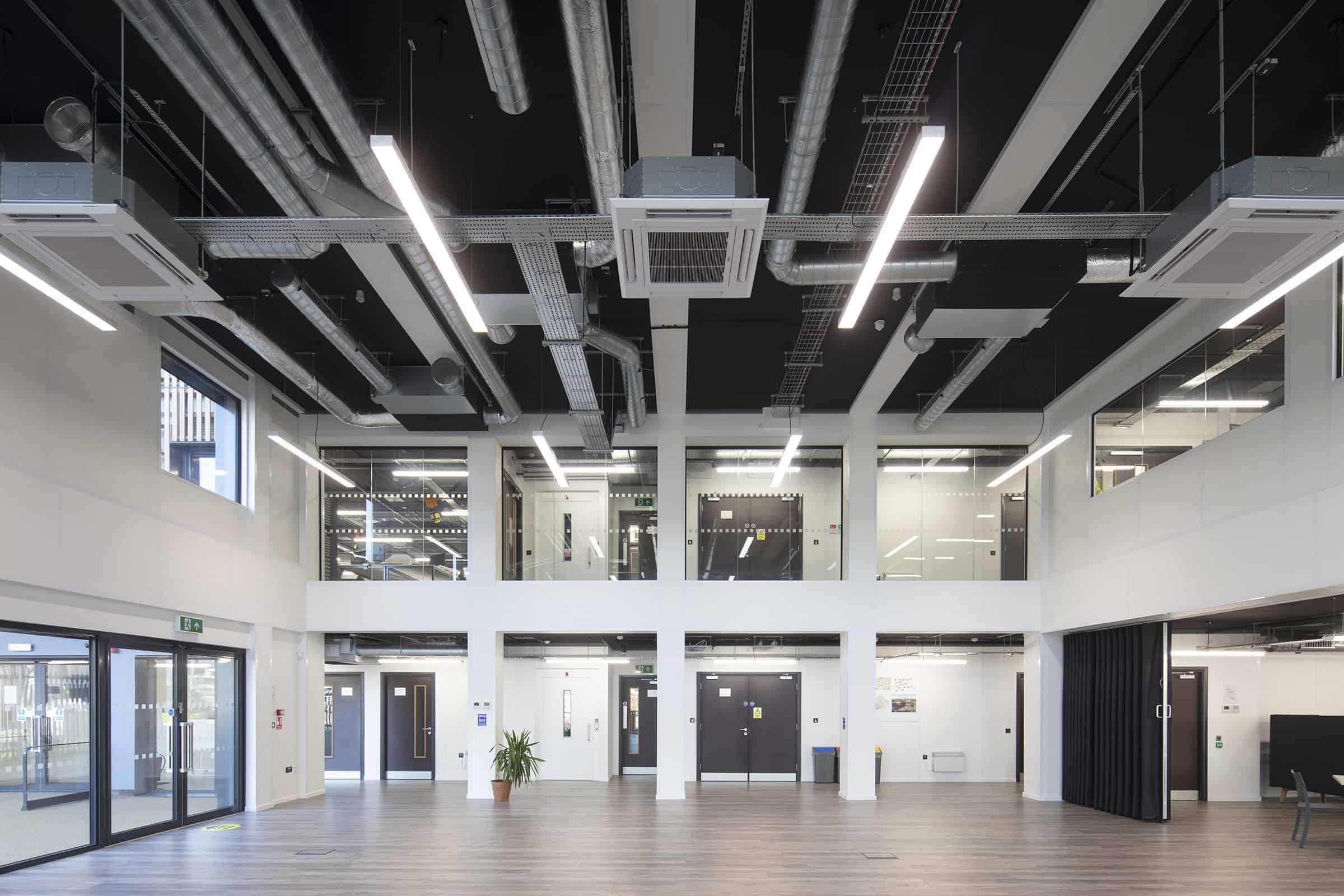 The modules were engineered to create a large double span exhibition, events, and cafeteria space. There are four large ‘makerspaces’ for practical learning, viewing galleries, smaller conference-style meeting and teaching rooms, a full-height glazed entrance, offices and student common room.