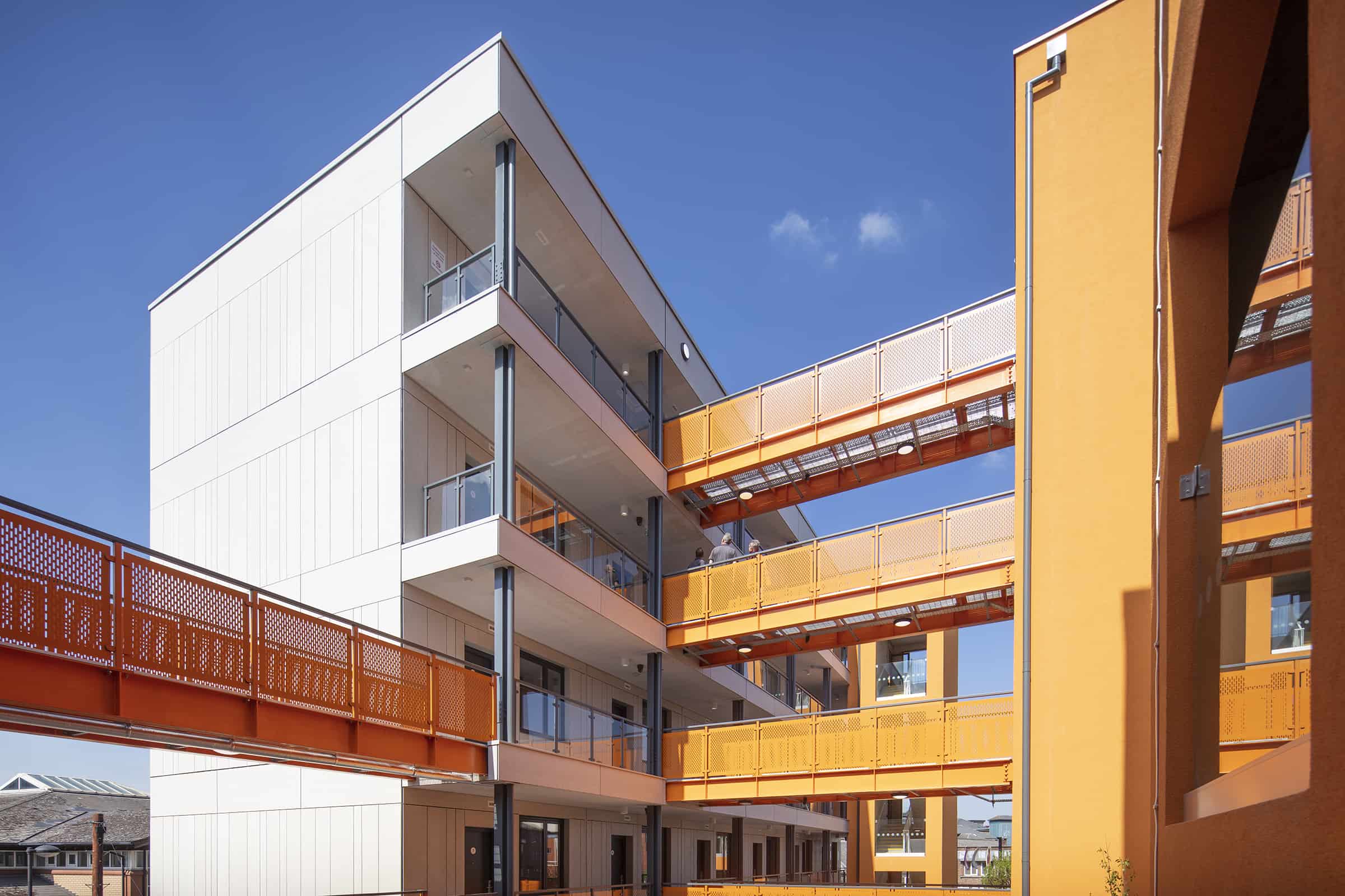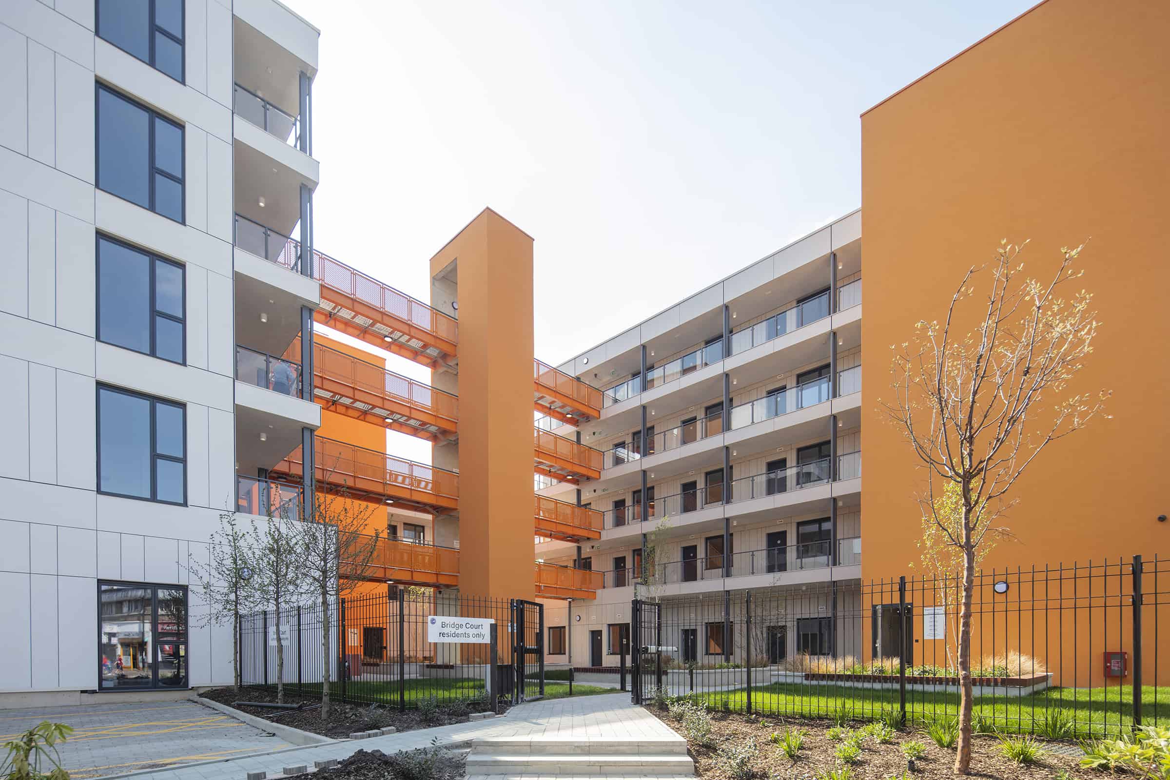 The project in the Desborough area of High Wycombe was delivered by principal contractor Premier Modular with its construction partner Claritas Group. The one-bedroom apartments were fully fitted out offsite at Premier’s factory in East Yorkshire and arrived on site complete with shower rooms and kitchens pre-installed.The homes are constructed around a central courtyard which will be a valuable amenity space for residents. A housing management office and laundry are located on the ground floor, with refuse stores and cycle storage in the plaza. The building has been designed to enhance the local area and to deliver a high standard of environmental performance. The energy-efficient ‘fabric first approach’ to construction has increased the level of insulation, reducing heat loss and air infiltration. There are also roof-mounted solar panels to generate renewable electricity. With fabrication and fitting out of the apartments taking place in a controlled factory environment, offsite manufacturing achieves a higher and more consistent quality of finish. The approach has also helped to address the site constraints – Bridge Court is built on the site of a former car park and there was a requirement to maximise the building footprint for housing provision. According to Peter Skinner of Wilberforce Consulting, “As a project manager for Buckinghamshire Council, I worked with Premier through the tender negotiations and oversaw the installation of the apartments on site. Their team was easy to work with at each stage, with a genuinely collaborative and transparent approach. The quality of their offsite building system and the apartments is very good and exactly as needed.” The three and five-storey scheme has been finished in a palette of colours including terracotta, slate grey and off white to complement the surrounding local area. The apartments are accessed by lifts and staircases built using in-situ construction. There are two accessible apartments, each with a parking space.